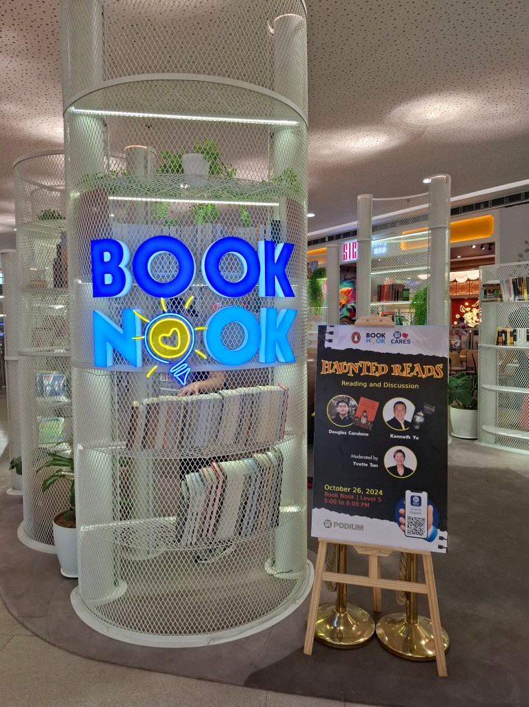It’s hard to resist comfortable seats and shelves upon shelves of books (some for swapping, some part of a permanent collection). Welcome to the Book Nook, the venue for a Halloween themed book talk, HAUNTED READS, organized by Penguin Random House SEA, featuring two of its authors, Douglas Candano (Infinite Lives, Infinite Deaths) and Kenneth Yu (Mouths to Speak, Voices to Sing), moderated by Yvette Tan (herself an award-winning horror writer, her latest being Seek Ye Whore).
